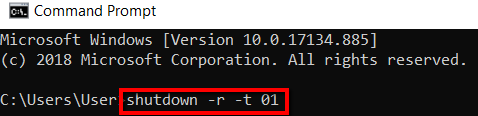 - Komut istemi penceresine şunu yazın: shutdown-r-t 01 ve enter'a basın.